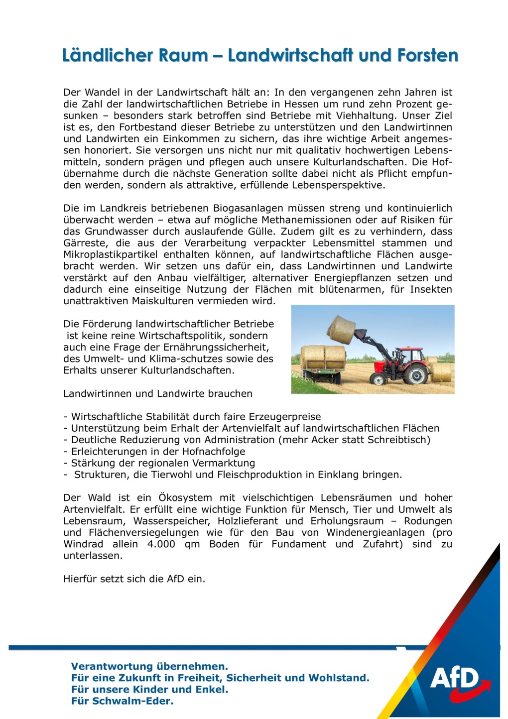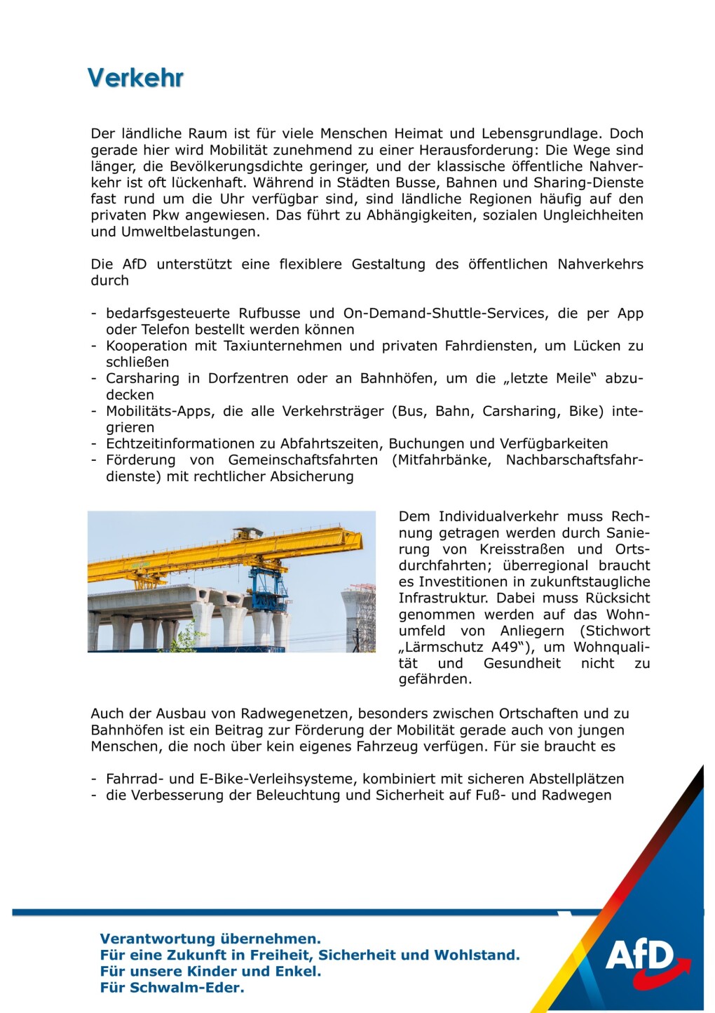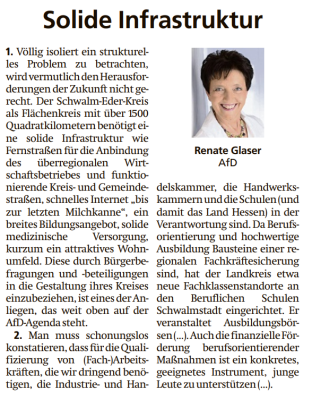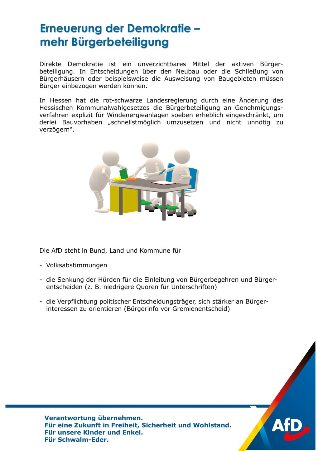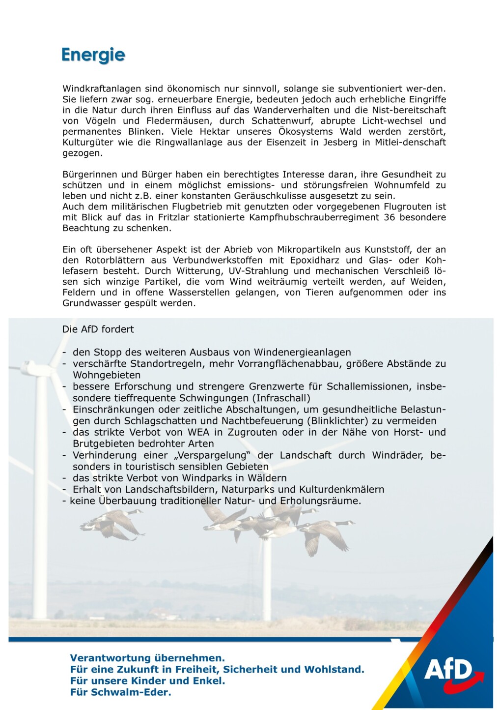 Beschlossen wurde auch das Kommunalwahlprogramm, mit dem die AfD in Schwalm-Eder zur Wahl des Kreistags und in einigen Städten und Gemeinden zu StaVo und Magistraten antreten wird. Die Schwerpunkte liegen dabei in der Stärkung des ländlichen Raums durch verbesserte Infrastruktur (Neu- und Ausbau von Straßen, ÖPNV-Taktung und Glasfaserausbau), Wohnraumgewinnung, Förderung von Mittelstand und Landwirtschaft, Sicherstellung umfassender, medizinischer Versorgung und der Stärkung der Demokratie durch eine intensivere Einbindung von Bürger und Bürgerinteressen in Entscheidungsprozesse politischer Gremien. „Und zwar BEVOR der Drops gelutscht“ ist, betont Renate Glaser. Bürgerinnen und Bürger zu einem Info-Abend über die Errichtung von Windenergieanalagen einzuladen, NACHDEM Stadtverordnetenversammlung und Magistrat das Projekt bereits beschlossen haben, ist nicht nur kein guter Stil, sondern karikiert das Instrument einer Bürgerbefragung oder Bürgerbeteiligung. „Wir wollen echte, demokratische Prozesse, wenn es um elementare Eingriffe in das Lebensumfeld von Bürgerinnen und Bürgern geht oder um Projekte, mit denen sich noch unsere Kinder und Enkel beschäftigen werden müssen“.